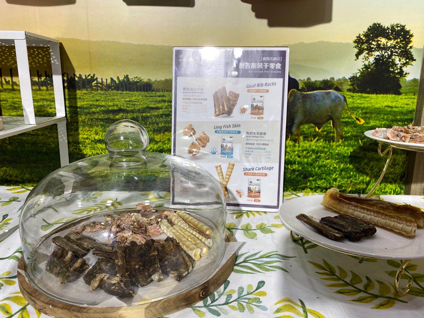 耐吉斯一共上市六款新品零食:风干小牛肋骨、风干牛筋条、风干牛肝片、风干羊肋排、风干鳕鱼皮、风干鲨鱼软骨。每款零食因为低温风干保留更多营养,各自具备不同的健康功能。据悉,耐吉斯新西兰进口风干零食将在10月左右正式上市,本次展会并未正式开售,仅作展示,但展会2天以来反响极好,已有各地经销商、店主提前预定。