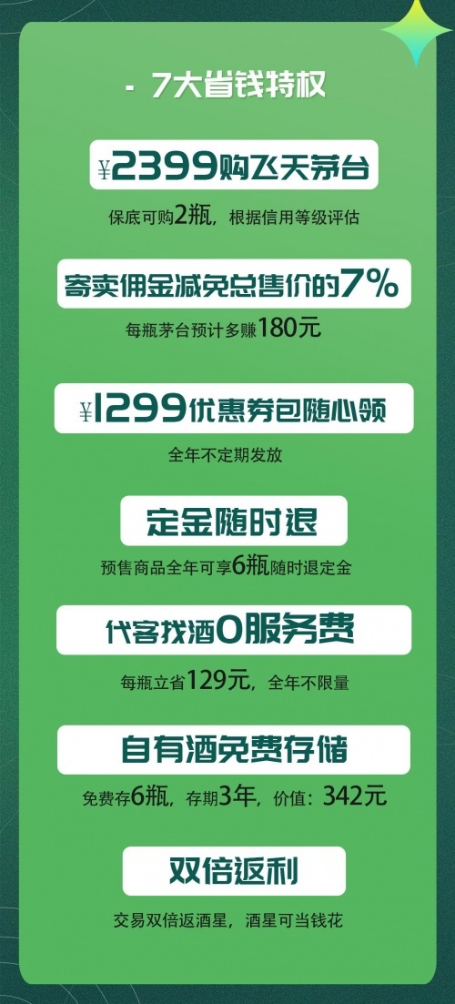 用户入会可以享受2399购飞天茅台的超值权益和多项专属权益。可以说,一张会员卡涵盖了酒票平台的所有消费场景,成为付费会员,你就能享受到与之相匹配的专属服务。