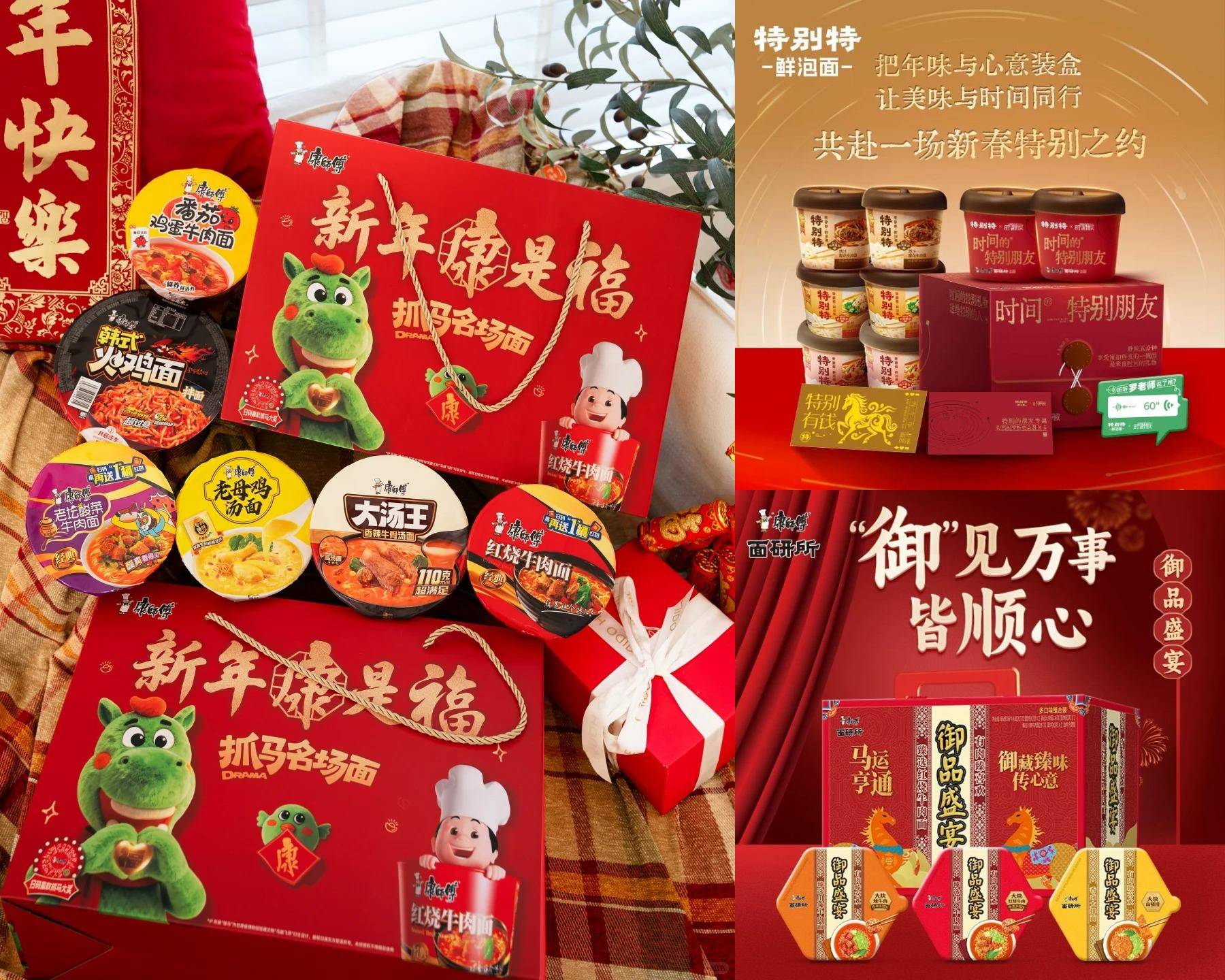 不仅口味越来越新鲜多元,康师傅近年来持续推出的“御品盛宴”、“特别特”等主题礼盒,将多款高端面品进行组合与包装升级,显著提升了产品的礼品属性。今年更结合“马踏飞燕”文物IP与“抓马”网络热梗,推出“新年康是福抓马名场面”文创礼盒,巧妙地将品牌谐音“康是福”转化为新年祝福,以年轻化、趣味化的设计语言,解决了“拿得出手”的体面需求。