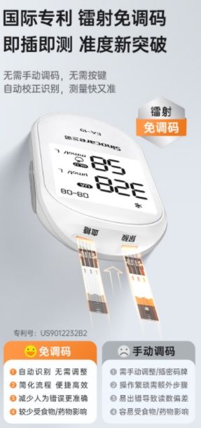三诺尿酸仪EA-19创新性整合血糖、尿酸双检测功能,它搭载双AFE核芯,结合血糖、尿酸双重原研算法校准,仅需一次采血,即可5秒完成血糖检测,10秒获取尿酸值。对于同时患有糖尿病(常伴发高尿酸)的人群,可减少多次采血的不便,提升监测效率。