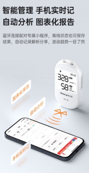 此外,使用测尿酸的仪器家用设备进行高频次尿酸监测的核心价值在于建立“数据检测-及时反馈-行为干预”的良性循环。三诺尿酸仪 EA-19 还可通过蓝牙将检测数据上传到 “三诺健康” 小程序,并生成直观的趋势图表。患者能够依据图表,结合自身日常饮食、作息等记录,精准分析尿酸波动的根源,从而制定出个性化控制方案,这无疑是实现长期健康管理的关键所在 。